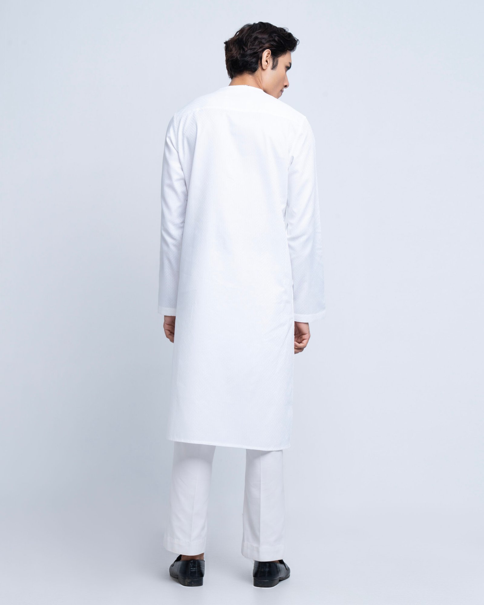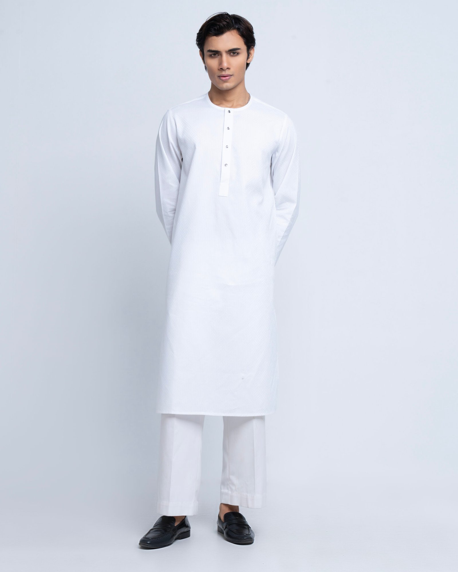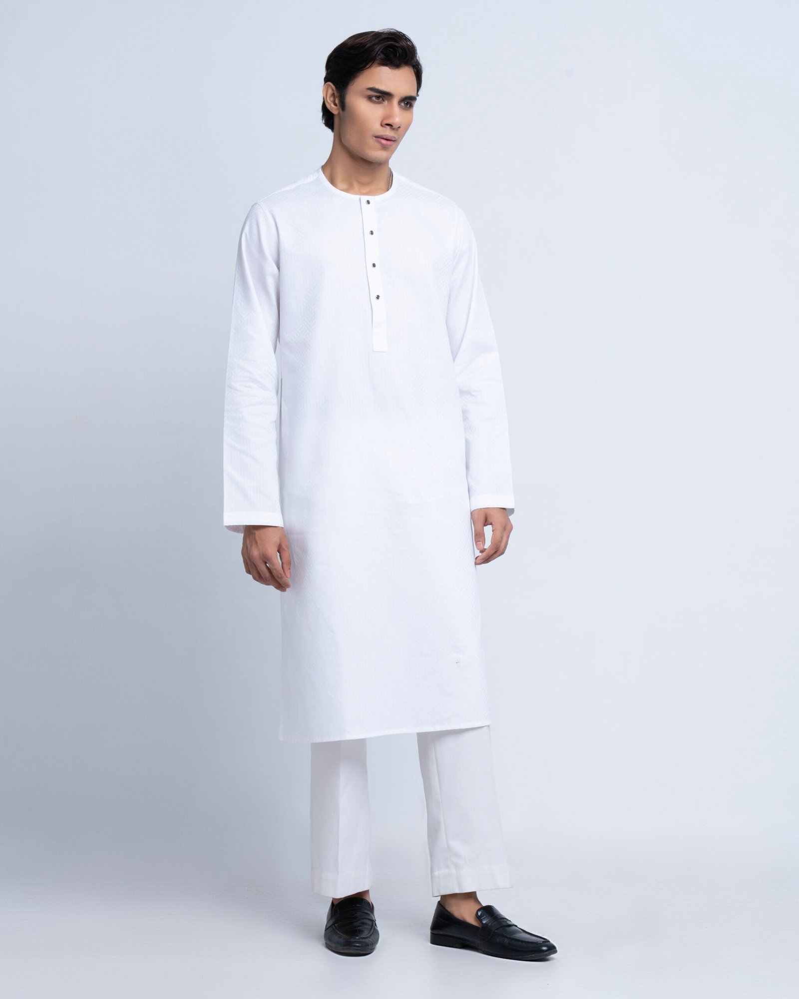 Featuring a modern round Neck collar, straight-cut design, and a buttoned placket, this Panjabi blends tradition with contemporary style. The crisp white shade adds a touch of purity and versatility, pairing perfectly with pajama pants or trousers.
