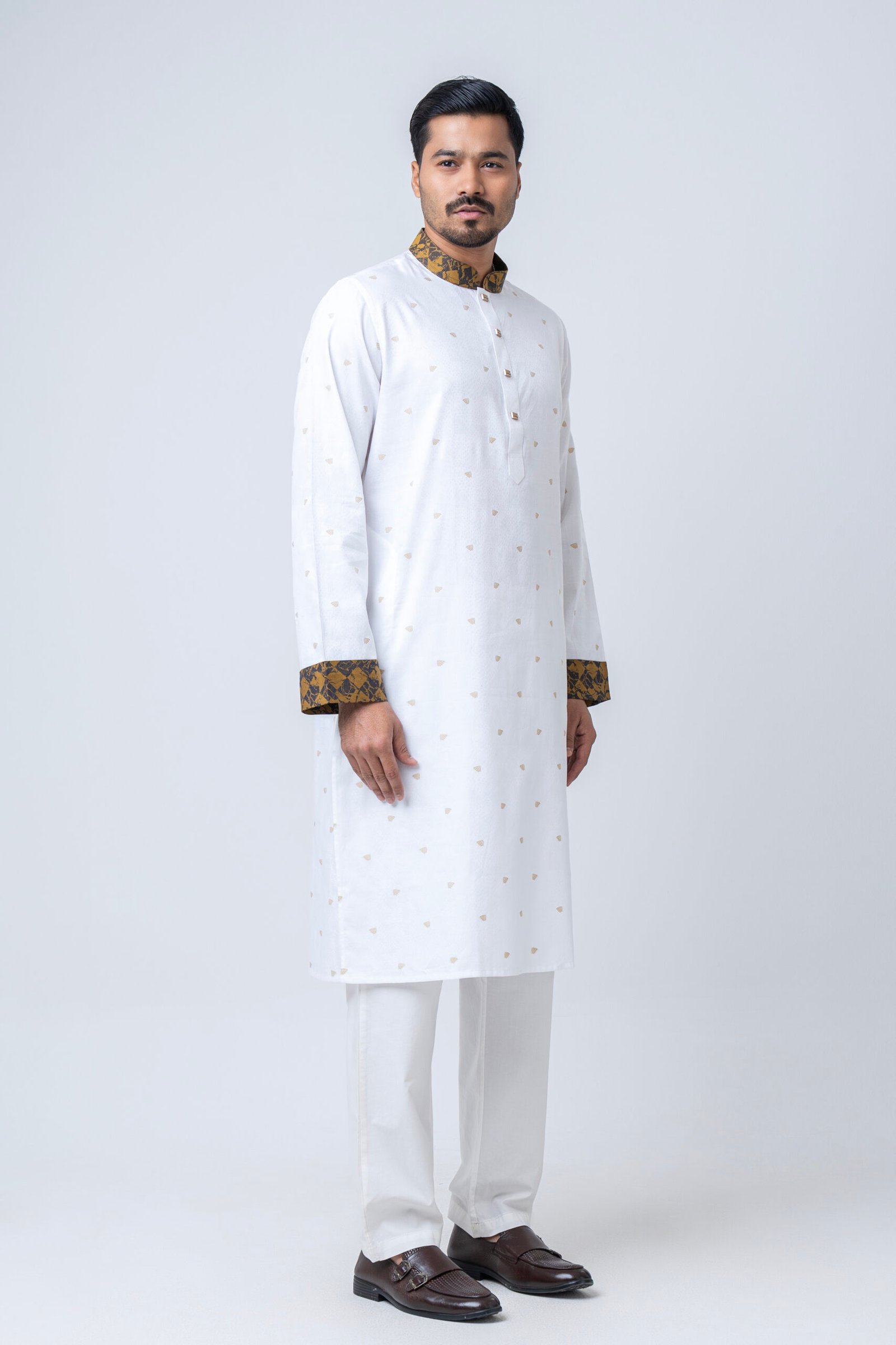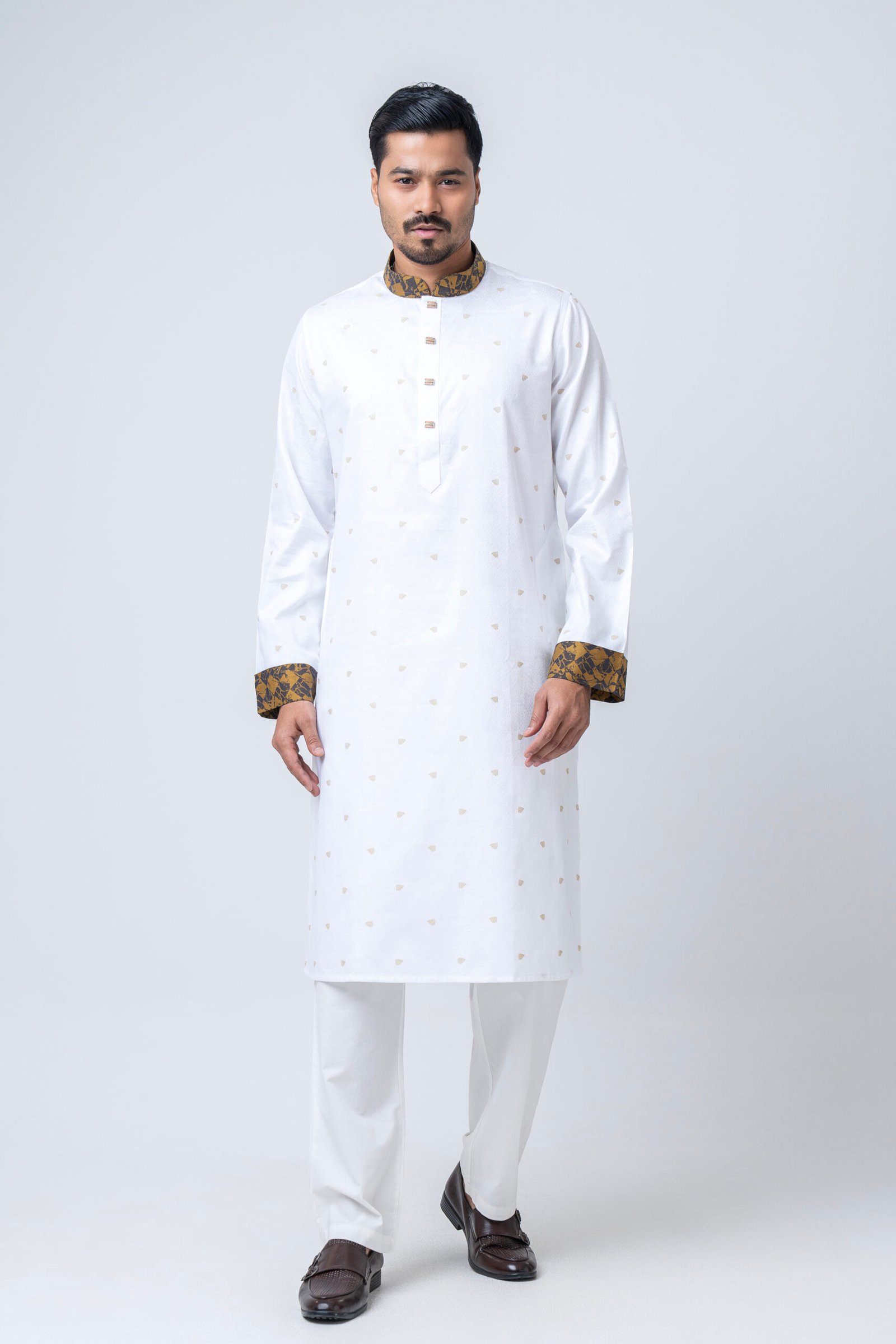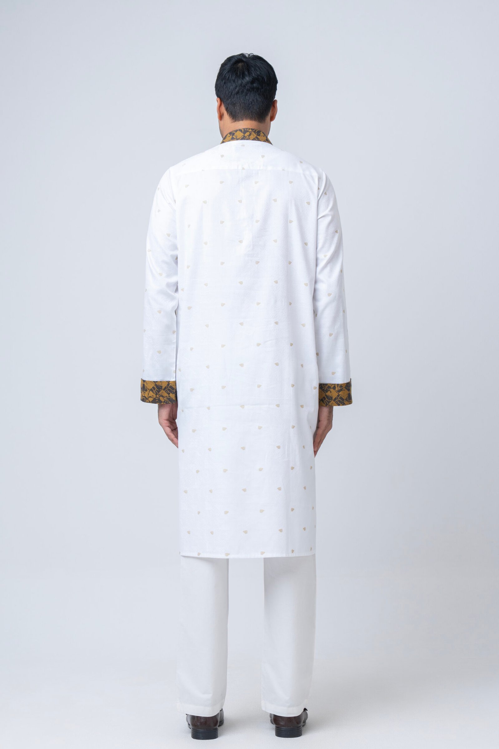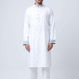 Step into elegance with our Classic White Panjabi with Gold Contrast Collar & Cuffs, a perfect blend of tradition and modern sophistication. Crafted from premium fabric, this Panjabi features delicate golden motifs that add a refined texture without overpowering its pristine white base.