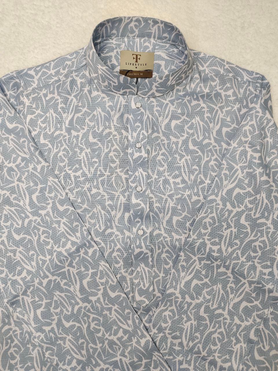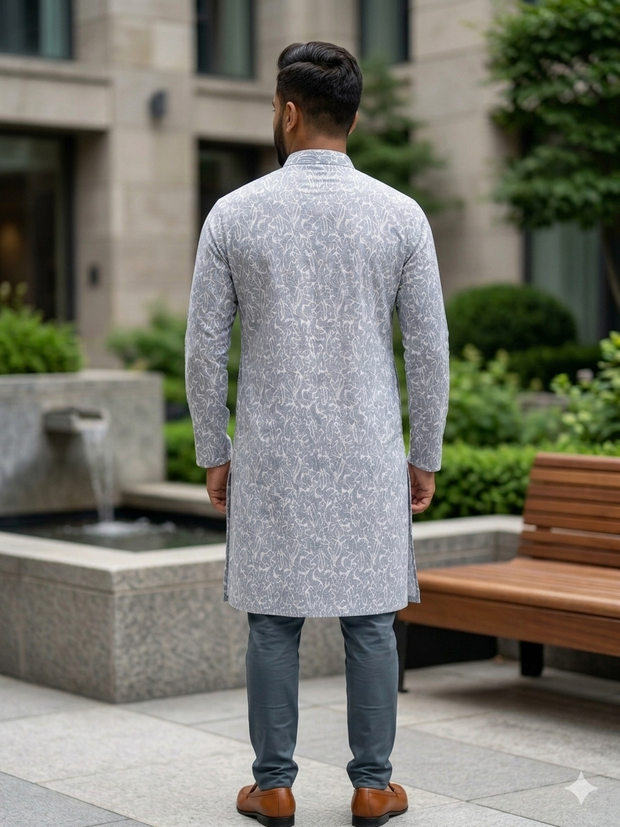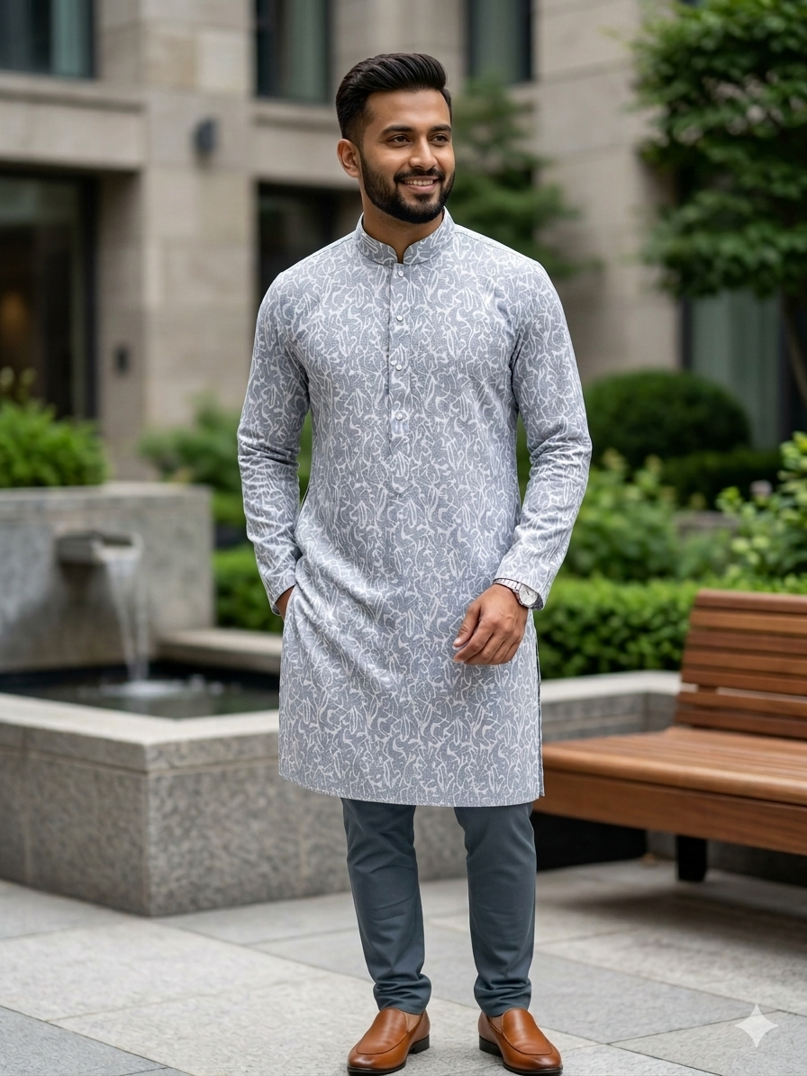 The elegant abstract printed pattern gives the Panjabi a fashionable appearance, while the Mandarin collar and decorative front buttons add a touch of sophistication. This Panjabi is ideal for Eid celebrations, Jummah prayers, festivals, family gatherings, and special occasions.