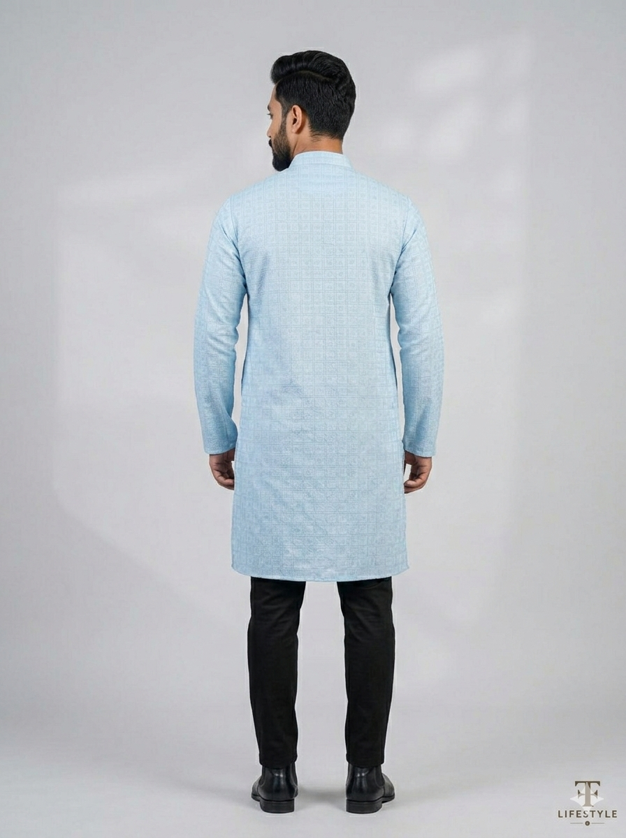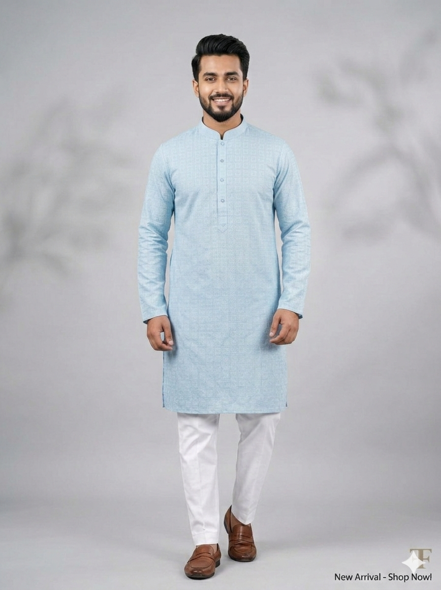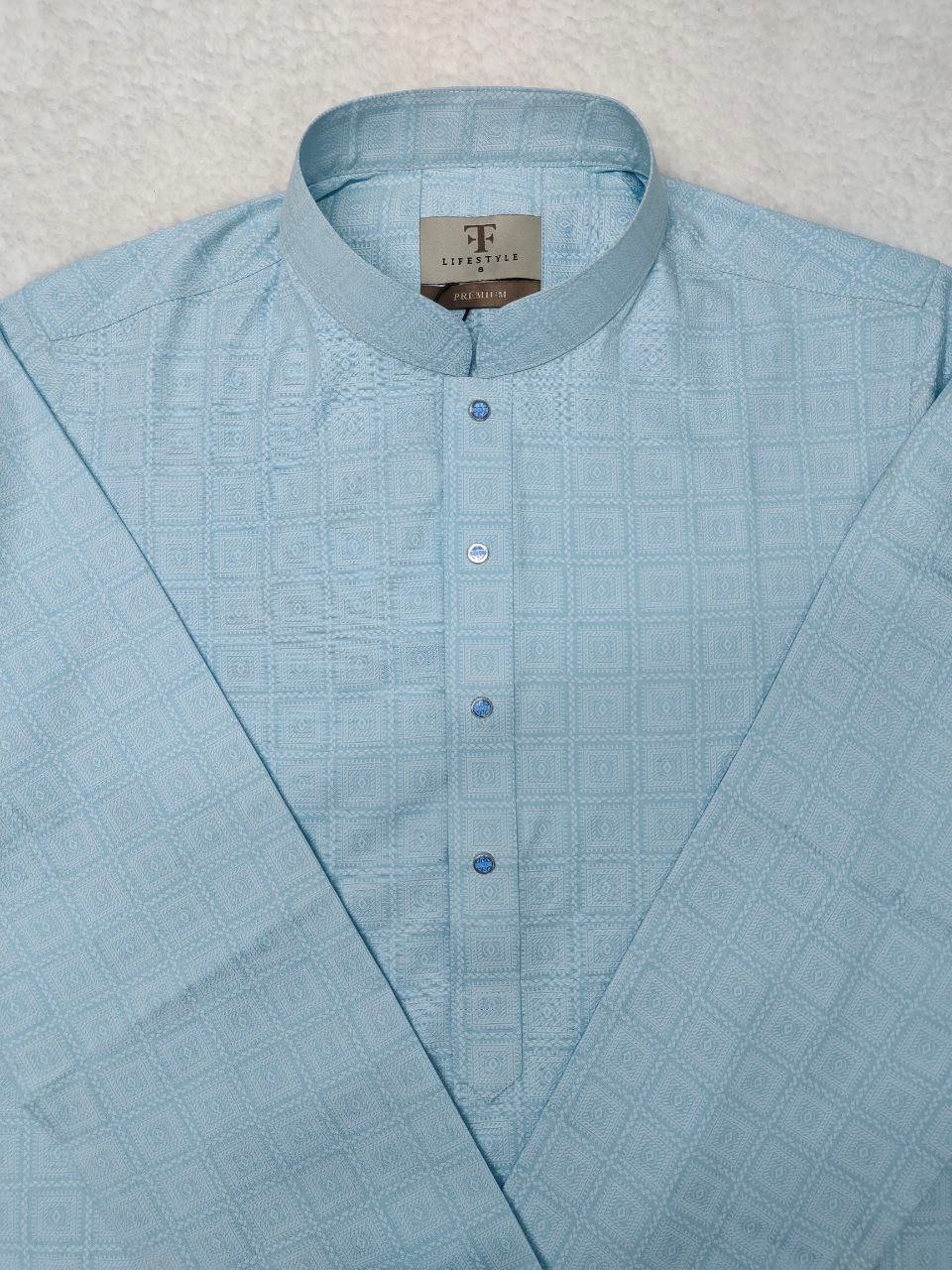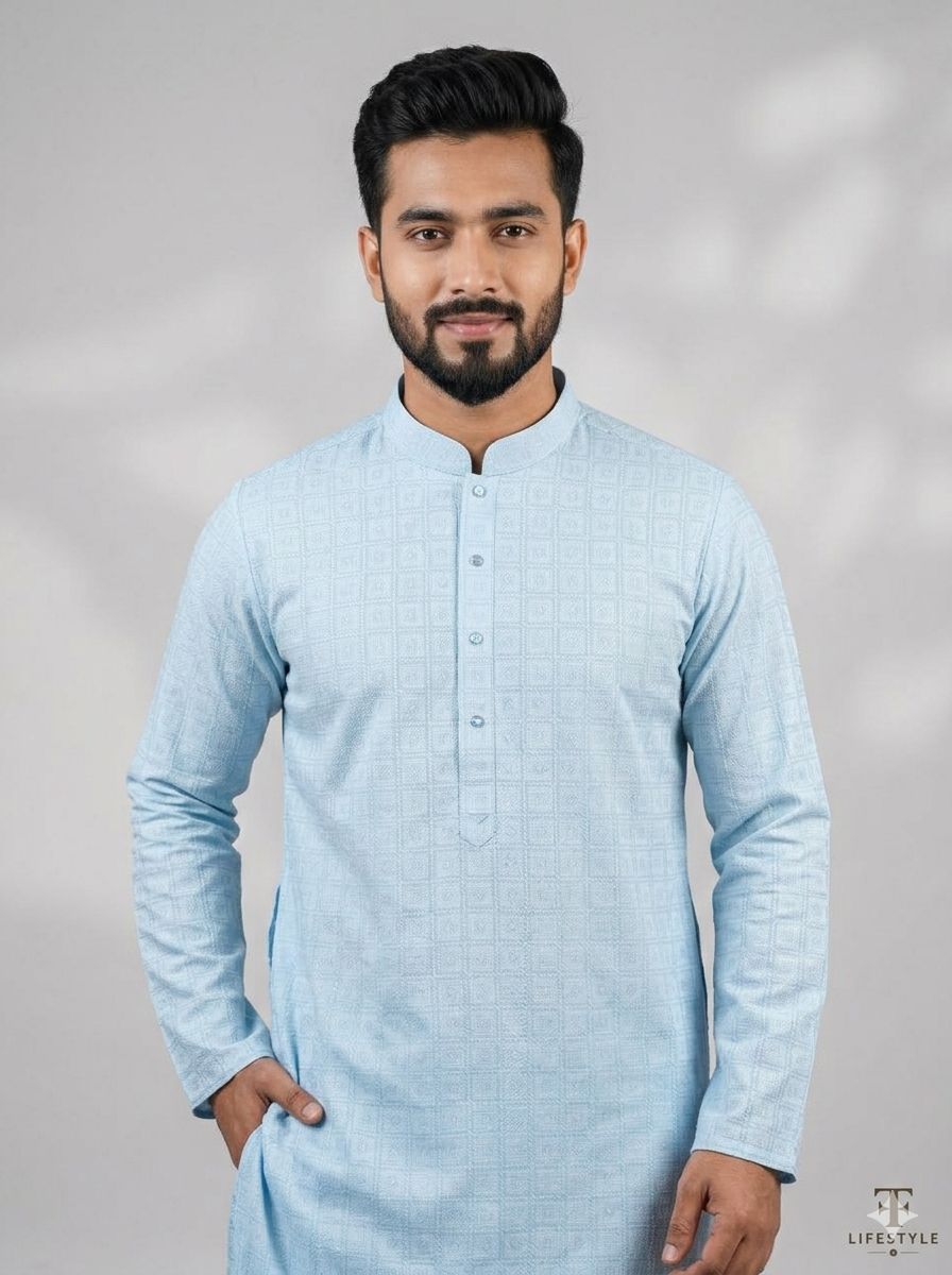 Enhance your traditional style with this elegant Premium Jacquard Cotton Panjabi. Designed in a refreshing sky blue shade with subtle geometric woven patterns, this panjabi delivers a classy and sophisticated look.