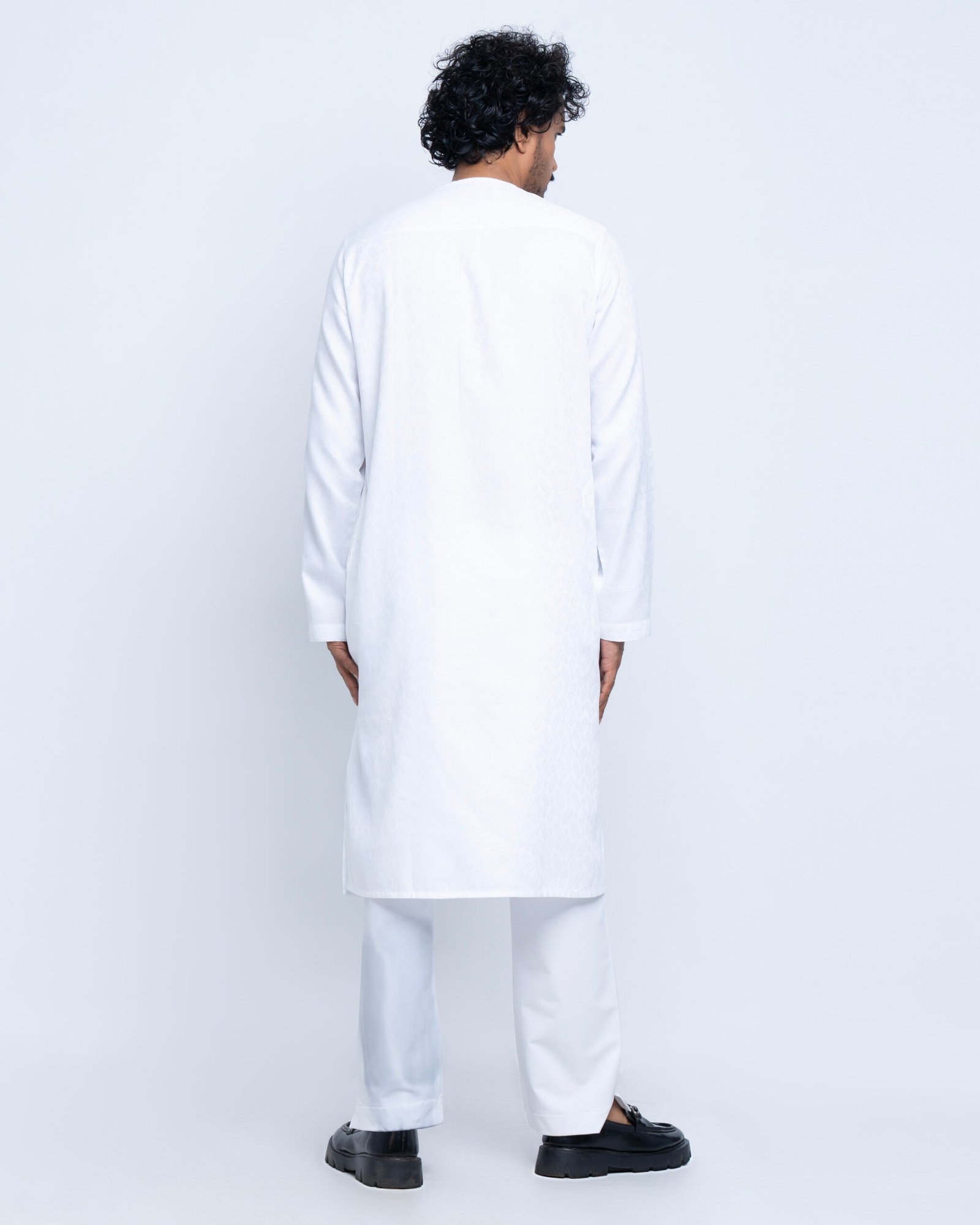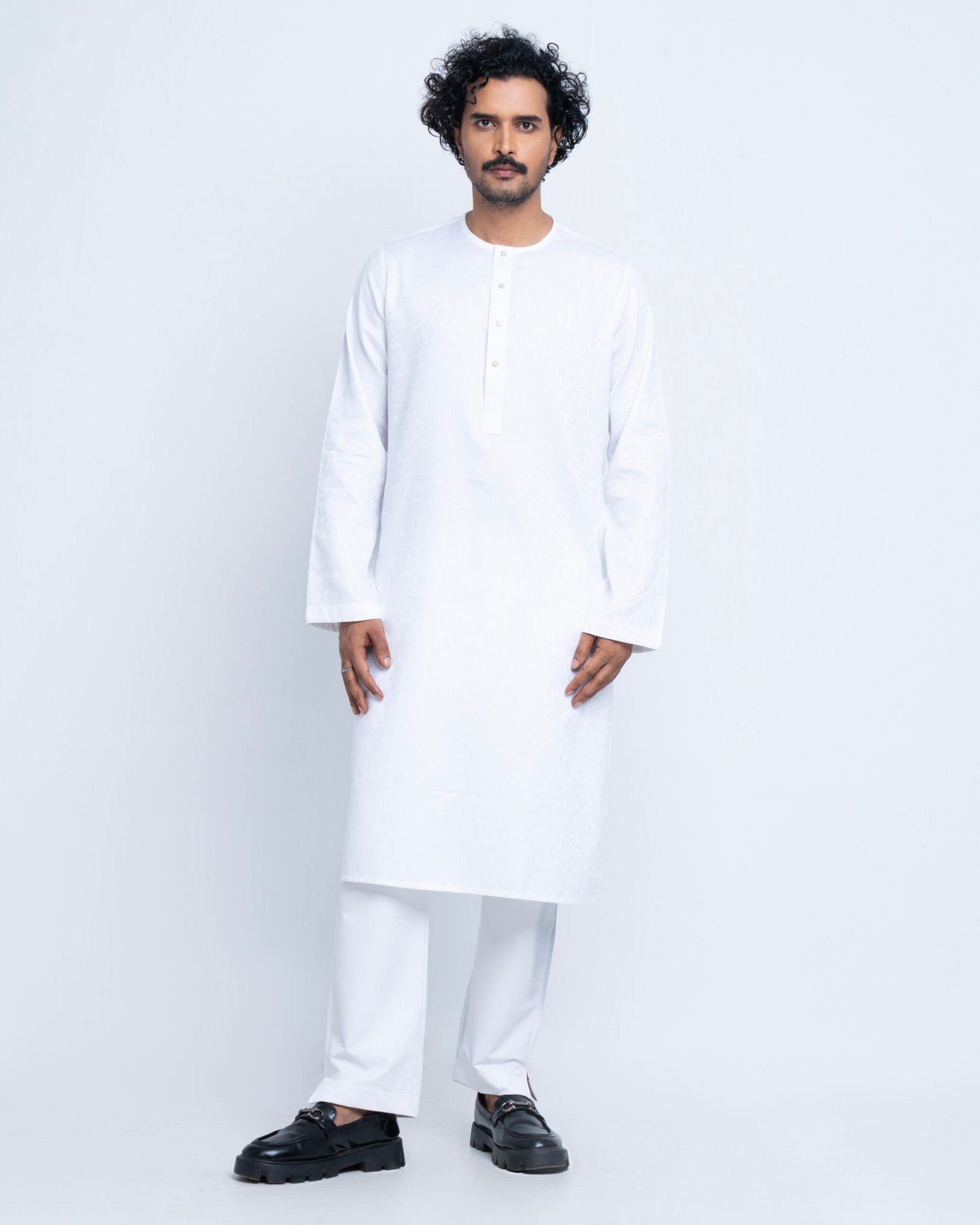 Featuring a modern round Neck collar, straight-cut design, and a buttoned placket, this Panjabi blends tradition with contemporary style. The crisp white shade adds a touch of purity and versatility, pairing perfectly with pajama pants or trousers.